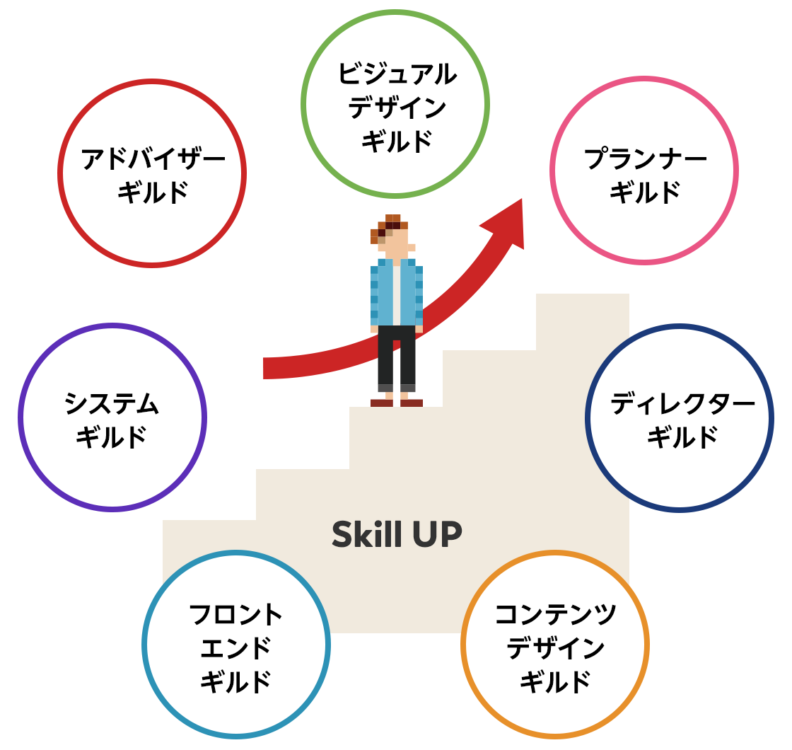 Web制作に必要なスキル領域を7つに分け、各ギルドでスキル向上の取り組みを行っています。